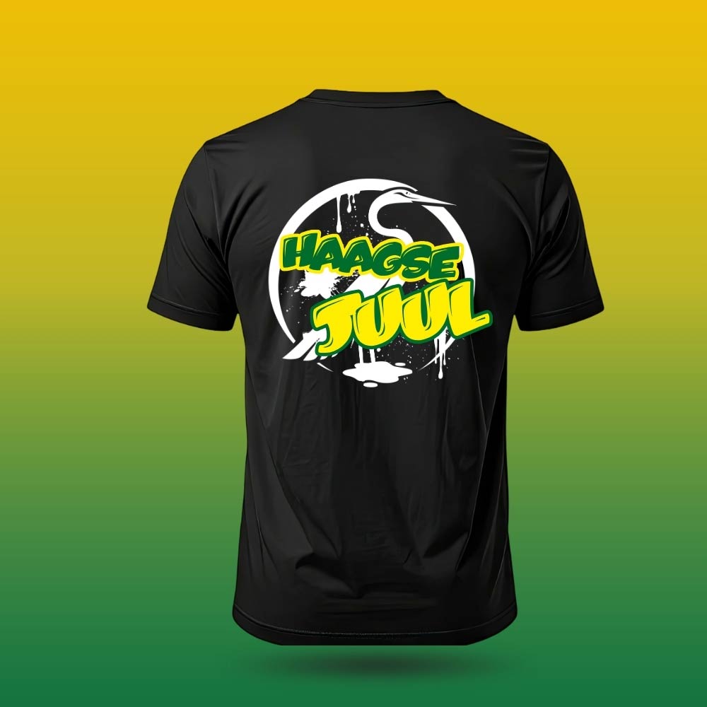Als jij de Haagse humor van Juul wel kan waarderen, dan is dit t-shirt wel iets voor jou! Het logo met de Haagse reigâh op de voorkant in het klein en in het groot op de achterzijde. Toevallig ook het favoriete shirt van Juul omdat het shirt ook heerlijk zit.